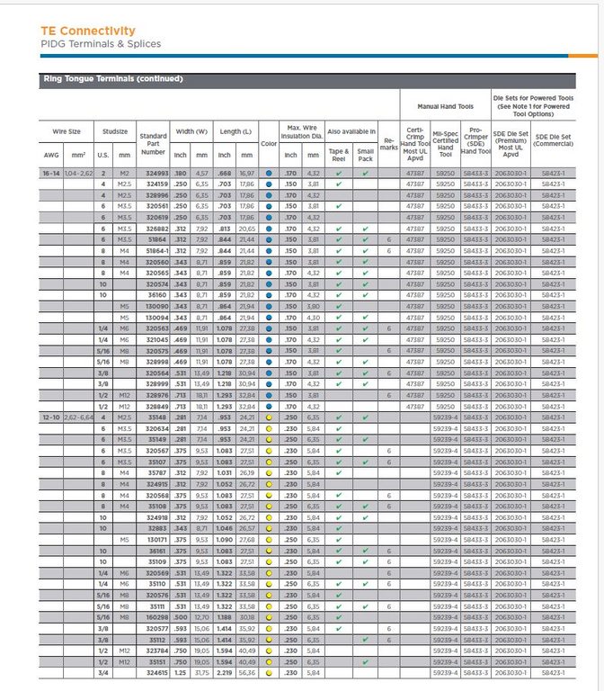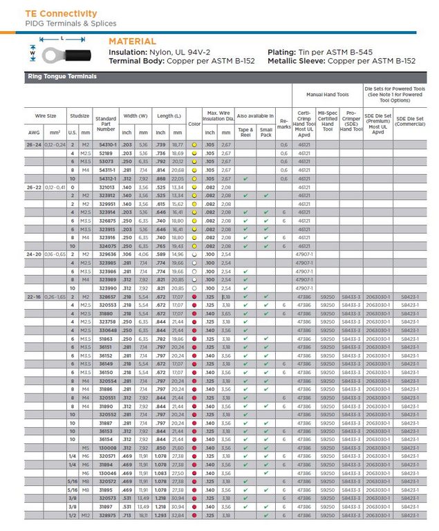 TE connectivity PIDG ring terminals for larger wire sizes and studs, compatible with 58433-3 crimper